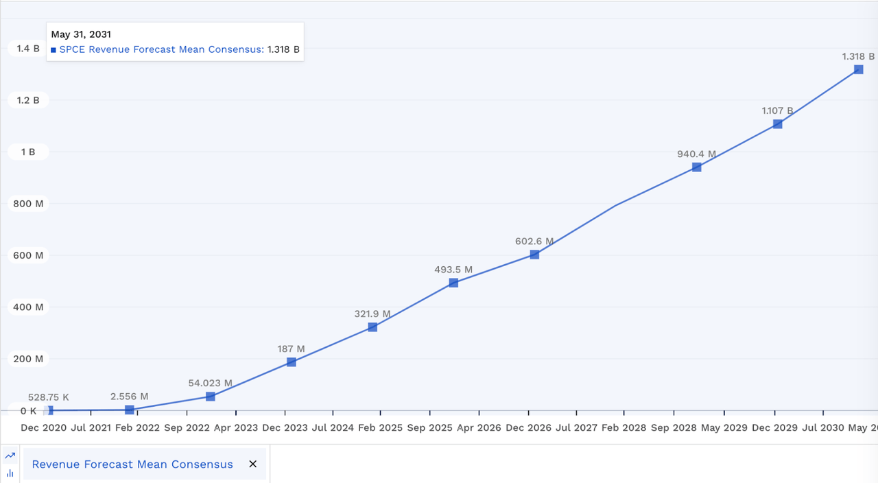 2030년까지 하위 궤도 세그먼트에 대한 2.9B 상당의 수익 기회에 대한 NSR의 연구를 고려하면(SPCE가 악용할 수 있는 인접 한 시장의 성장을 고려하지 않음), 2030년까지 총 예상 수익의 5.82B 가치의 컨센서스 추정치가 NSR의 총 수익의 2배를 대표했기 때문에 매우 낙관적인 것으로 보입니다.