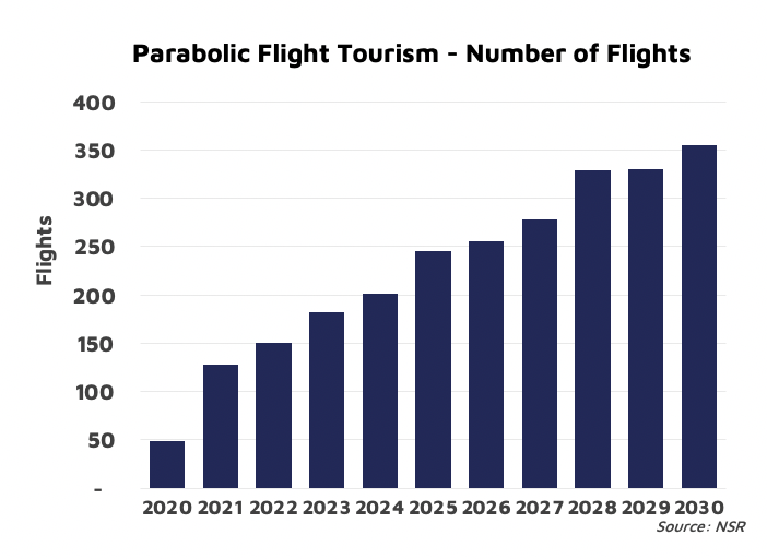 포물선 항공편 구간은 좌석당 $7,000 미만의 가격으로 가장 저렴한 구간이며, 대부분의 고객이 있을 것으로 예상되는 구간은 2030년까지 거의 30,000명의 승객을 비행할 것으로 예상됩니다. 그 결과, 이 구간은 빠르게 성장하고(아래 차트 참조 참조) 2030년까지 연간 350회까지 비행 빈도를 증가시킬 것으로 예상됩니다.