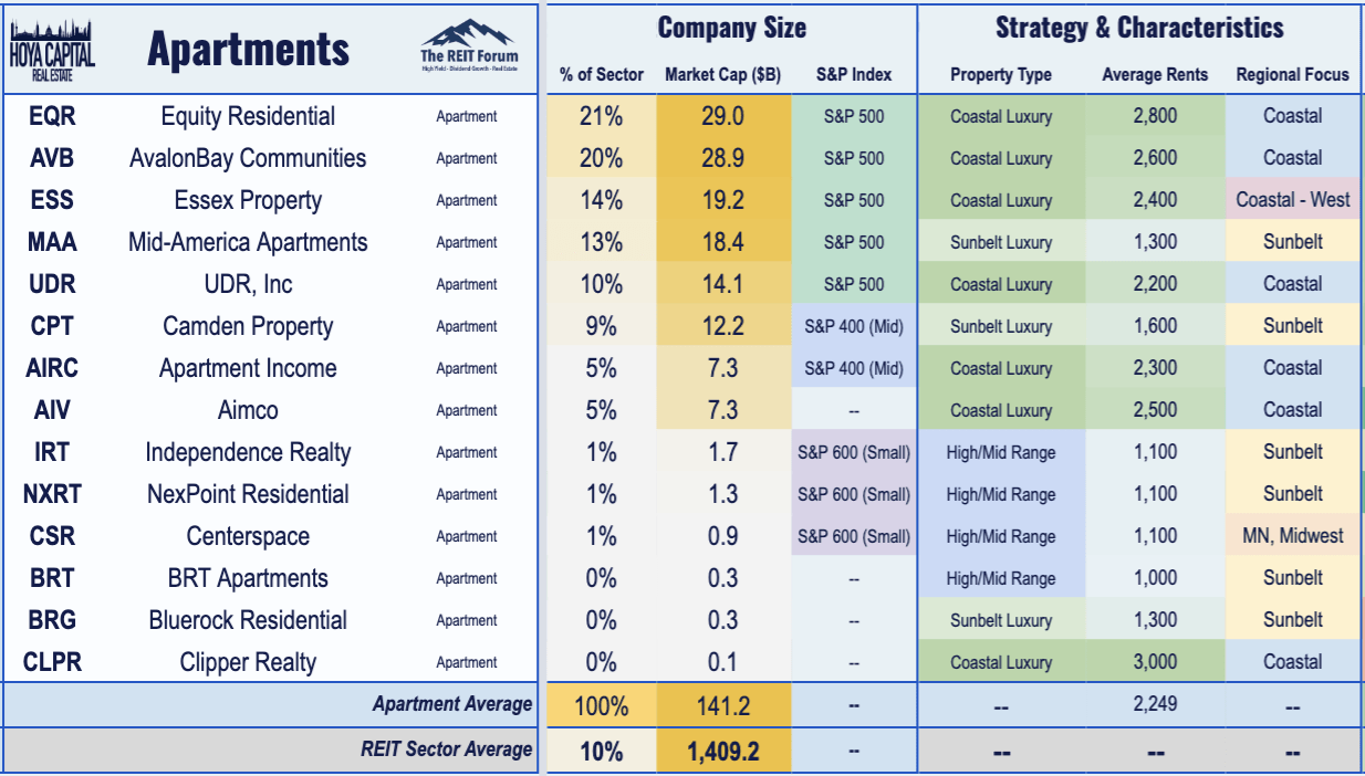 개별 아파트 리츠(REIT)는 해안 시장이나 선벨트 및 보조 시장에 초점을 맞추는 경향이 있습니다. 그러나 섹터로서 이러한 REIT는 미국의 주요 시장 대부분에서 지리적 노출이 상당히 균형을 이루고 있으며 품질 스펙트럼의 상위 계층 "럭셔리" 끝으로 더 크게 왜곡되는 포트폴리오를 소유하는 경향이 있습니다. 해안 아파트 로트는 주식 주거, 아발론 베이(AVB),에섹스 속성, AIMCO(AIV),아파트 소득(AIRC),및 UDR, Inc.(UDR) 반면, 선벨트 중심의 아파트 리츠캠든 부동산(CPT),미드 아메리카 아파트(MAA),독립 부동산, 센터 스페이스(CSR),넥스 포인트 주거, 블루 록 주거 성장(BRG)을포함한다.
