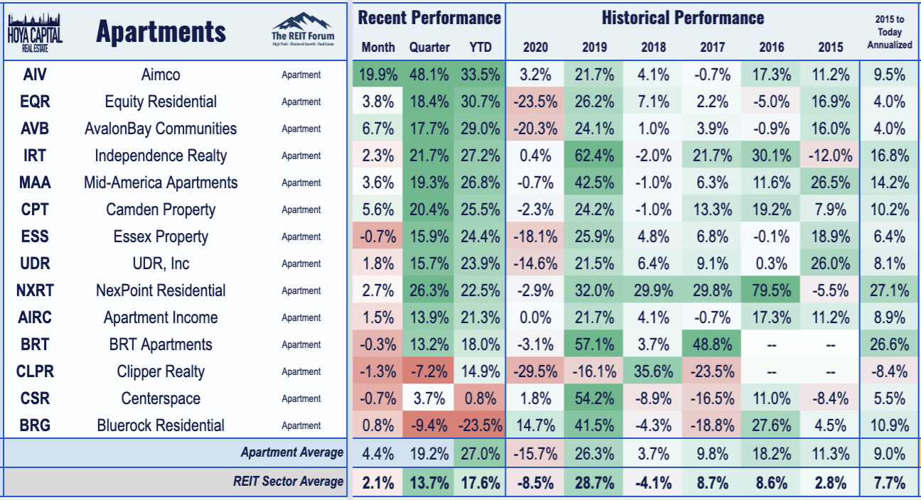 아파트 리츠 - 특히 시장 캡 가중 지수의 대부분을 구성하는 해안 REI는 코로나 바이러스 전염병의 끝이 눈에 보이는 대로 2020 년 말에 시작 긍정적 인 백신 뉴스의 물결에서 가장 중요한 수혜자 중 이었다. 2021년 아파트 리츠가 27.0% 상승하여 광대한 뱅가드 부동산 ETF(VNQ)의 17.6% 상승과 S&P 500 ETF(SPY)의 12.3% 상승률을능가합니다.