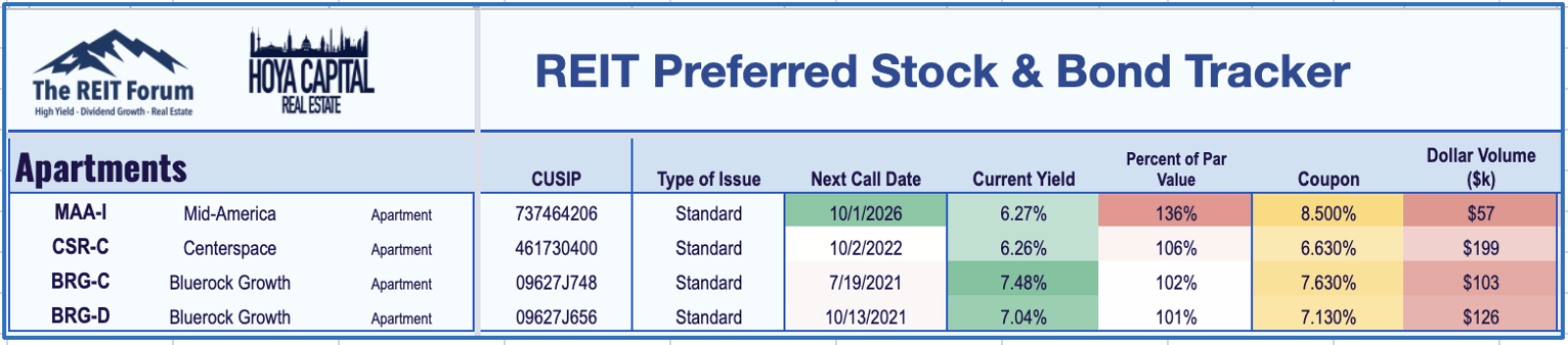 14개 아파트 중 3개 아파트가 중미(MAA)의 이슈 1개를 포함해우선증권을 제공합니다. PI), 투자자 부동산(IRET)에서 하나. PC),블루록 성장(BRG.PC, BRG.PD)에서두. 이 네 가지 문제는 모두 표준 누적 상환 우선주이며 평균 수익률은 6.4%입니다. 미드 아메리카의 외로운 문제는 상당한 프리미엄에서 거래 $50 파 값, 나머지 네 가지 문제는 매우 약간의 프리미엄에서 거래하는 동안. REIT 선호의 더 음소거 된 위험 / 반환 프로필을 강조, 이러한 바람직한 문제는 올해 대략 평평하고 다섯 모두 자신의 보통주를 능가했다.