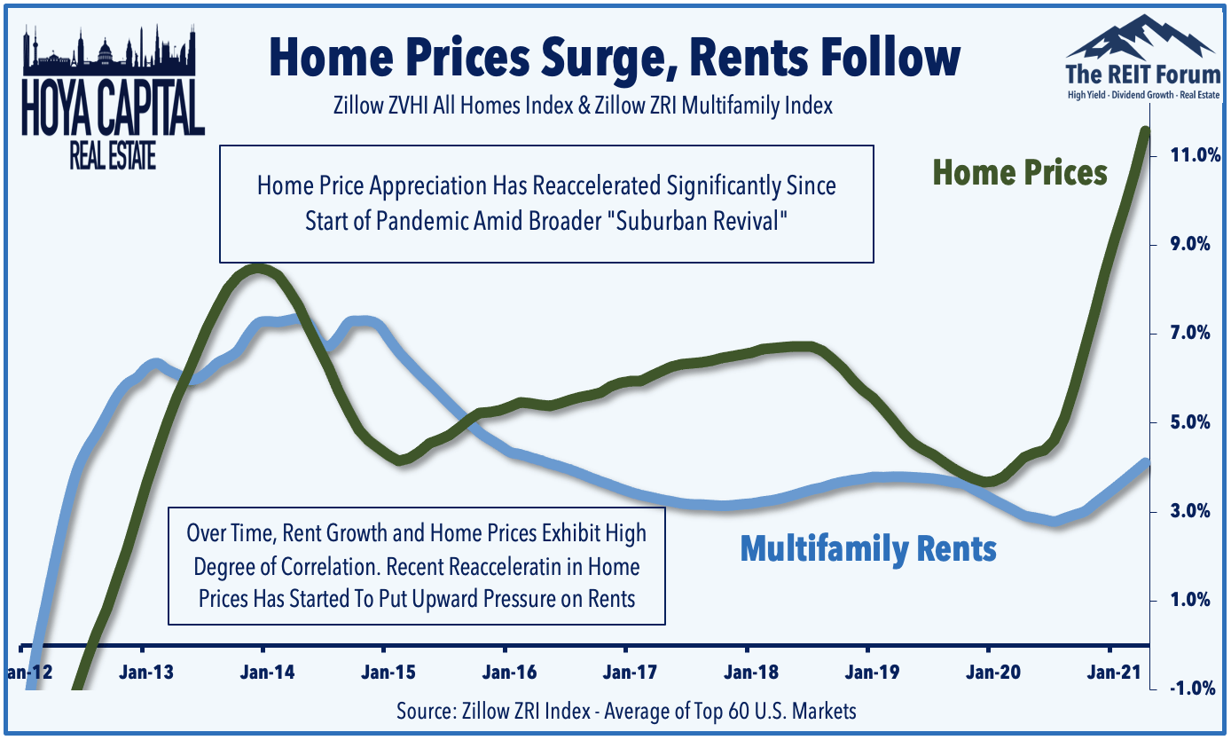 주택 형성의 인구 통계학적 및 전염병 중심의 호황이 주택 공급과 충돌하여 주택 공급량이 소유권 및 임대 시장 전반에 걸쳐 더 높은 주택 비용을 밀어 붙이기 때문에 전국의 임대료가 반년 만에 가장 빠른 속도로 급격히 급증함에 따라 임대인들은 다음 갱신 제안에 반갑지 않은 놀라움을 받게 될 것입니다. 2020년에 뒤쳐진 후, 아파트 리츠가 올해 거의 30%를 얻었으며, 1분기 실적실적의 강세에 힘입어 10개 아파트 리츠 중 7개가 연간 실적 가이던스를 올렸습니다. 아파트 리츠가 예전만큼 저렴하지는 않지만, 주택 공급이 지속적으로 적고 수요가 견고한 가운데 주택 가치를 "따라잡는" 임대료 상승률만큼 밸류에이션은 여전히 매력적으로 보입니다.