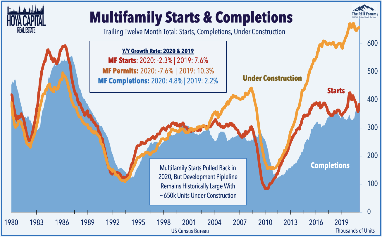 지난 몇 년 동안의 공급 성장은 아파트 REIT 부문을 모니터링할 수 있는 잠재적인 역풍으로 남아 있습니다. 2020년에 시작된 다가구 활동과 허용 활동은 전염병의 최악의 시기에 본질적으로 "종료"되었지만, 2021년 초에 이전에 지연되거나 지연된 프로젝트가 기본이 개선됨에 따라 "녹색 빛"이 주어지면서 다시 포효하고 있습니다. 납품은 2022년 말까지 연간 300k-350K 범위에서 역사적 평균에 비해 상승된 상태로 유지될 것이며, 이는 연간 공급 증가율의 약 1.5%에 달할 것입니다.