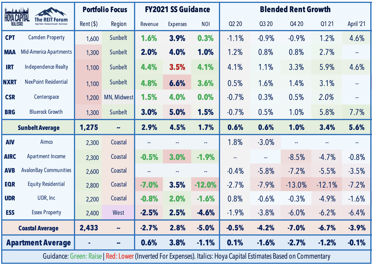 분기별 실적 보고서에 대해 자세히 설명하면서 해안과 선벨트 리츠 간의 운영 실적의 분기를 다시 강조합니다. 신규 및 갱신 리스의 점유율과 임대료 증가는 일반적으로 향후 수익의 미래 예측 지표로서 실적 시즌 동안 가장 면밀히 관찰하는 지표입니다. 중요한 것은 선벨트 리츠(Sunbelt REITs)는 3분기, 4분기, 1분기, 4월 사이에 혼합 렌탈 요금의 순차적 가속화를 지적했으며, 이러한 리츠 역시 평균적으로 점유율이 크게 상승한 것으로 나타났습니다. 위에서 설명한 Zillow 및 아파트 목록 데이터와 일치하여 2021년 초에 추세가 "덜 나빠지기"시작했으며 여러 해안 아파트 REIT가 2분기에 긍정적 인 임대료 증가를 보고 할 태세입니다.